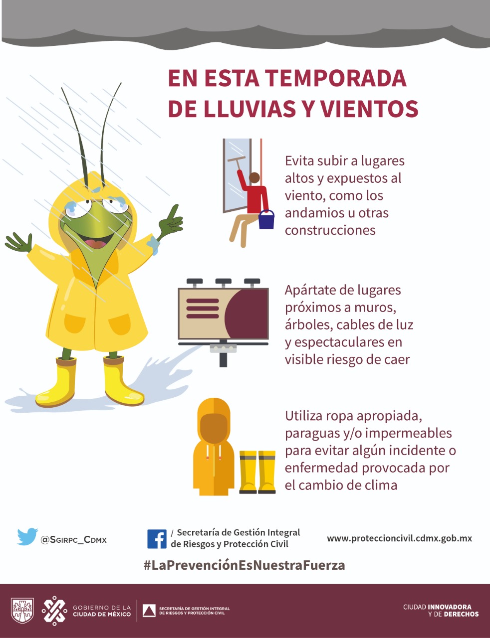 Por ello se recomienda a la población portar paraguas o impermeable y no arrojar grasas o basura en el drenaje, así como barrer coladeras y mantenerlas libres de basura u objetos que las obstruyan.