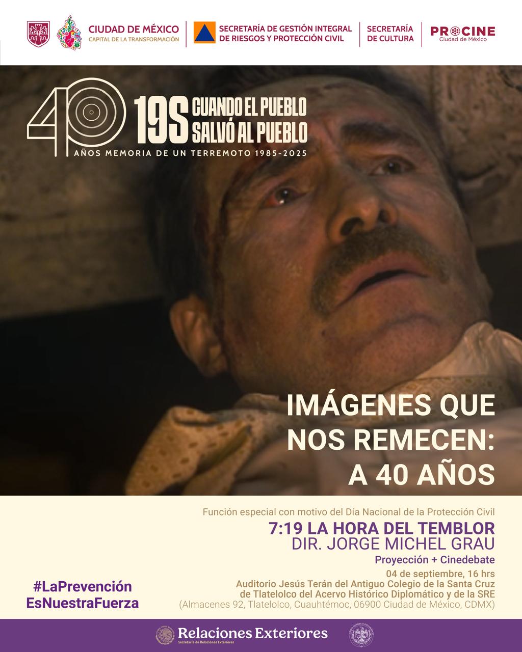 CDMX, 02 septiembre 2025.- En el marco de la jornada conmemorativa “40 años. Memoria de un terremoto 1985-2025. 19S Cuando el pueblo salvó al pueblo”, la Secretaría de Cultura de la Ciudad de México y el Fideicomiso para la Promoción y Desarrollo del Cine Mexicano (PROCINECDMX) invitan a una función especial de la película 7:19 La Hora del Temblor, dirigida por Jorge Michel Grau.