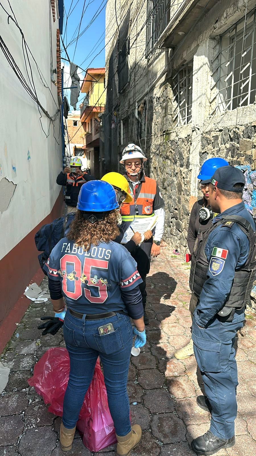 Este sábado continuaron los trabajos de apuntalamiento y acudió personal técnico de una empresa especializada en demoliciones para continuar con las tareas de levantamiento y registro en el sitio, a fin de hacer las evaluaciones correspondientes para valorar lo procedente en cada una de las casas afectadas.