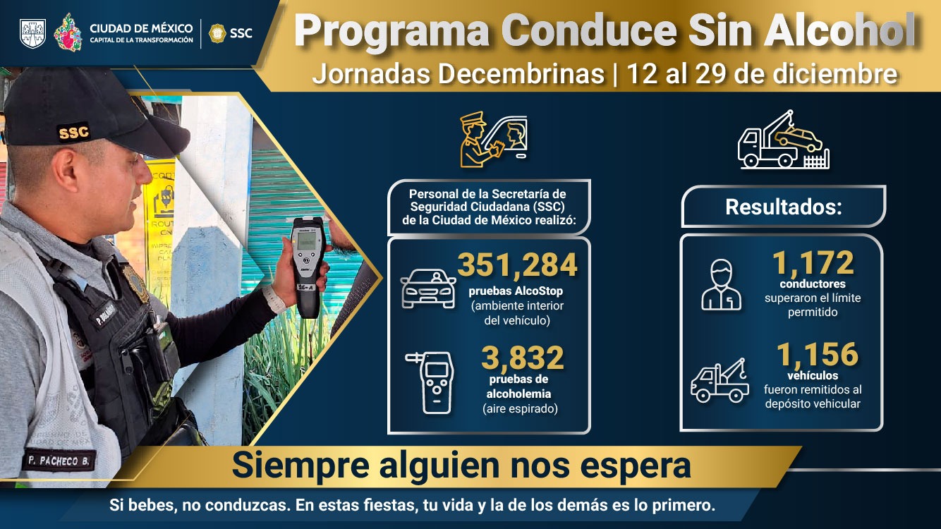 De acuerdo con cifras oficiales, la SSC realizó más de 355 mil pruebas preventivas y de alcoholemia del 12 al 29 de diciembre, confirmando que, pese a los llamados a la responsabilidad, cientos de conductores ponen en riesgo su vida y la de terceros durante las celebraciones de fin de año.