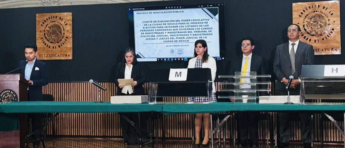 Ante algunos medios de comunicación presentes, en un salón de las oficinas del Zócalo, el Comité de Evaluación del Poder Legislativo Local seleccionó a las y los candidatos a los cargos de elección popular del Poder Judicial de la Ciudad de México en la Elección Extraordinaria del 2025.